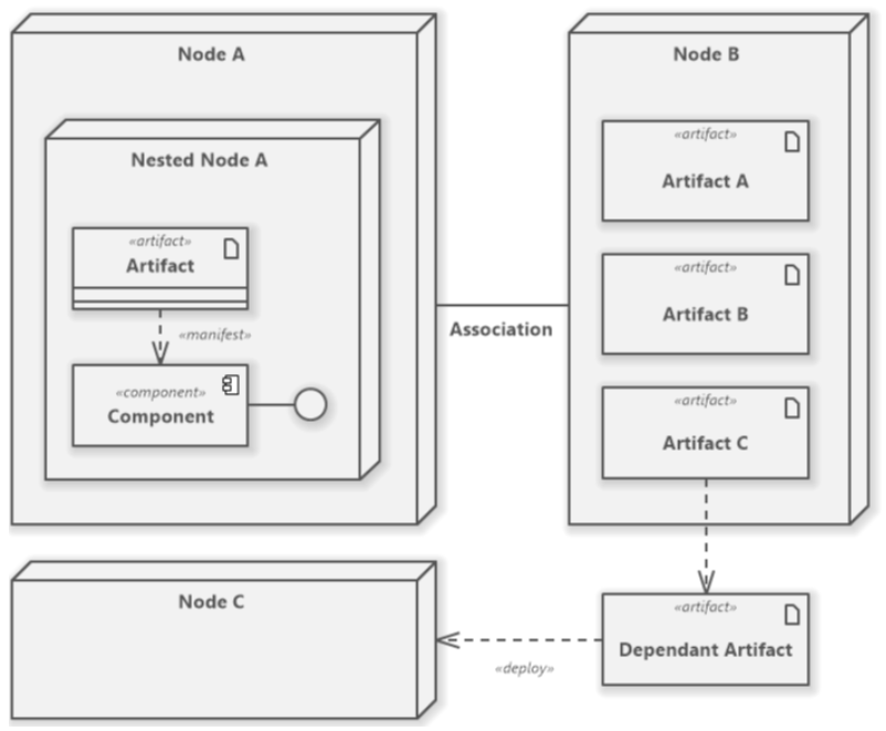 배치 다이어그램 : 물리 구조 표현, 컴포넌트의 종속성을 표현 |