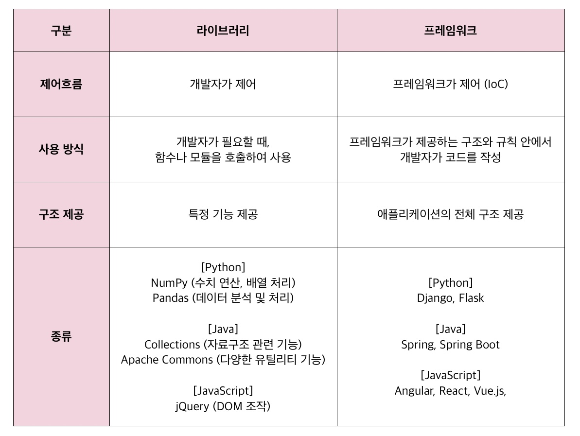 라이브러리는 개발자가 필요할 때 직접 호출하여 사용하므로, 제어 흐름이 개발자에게 있다.
