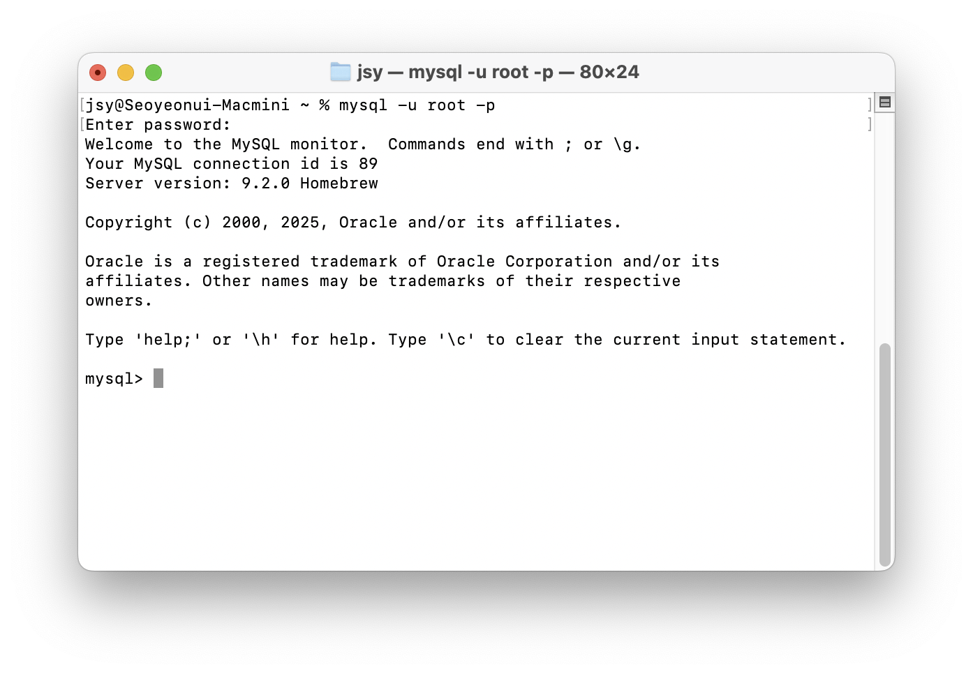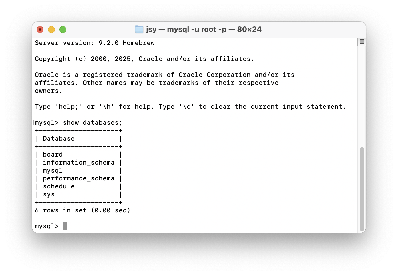 비밀번호를 입력하면 MySQL 쉘에 접속됩니다.