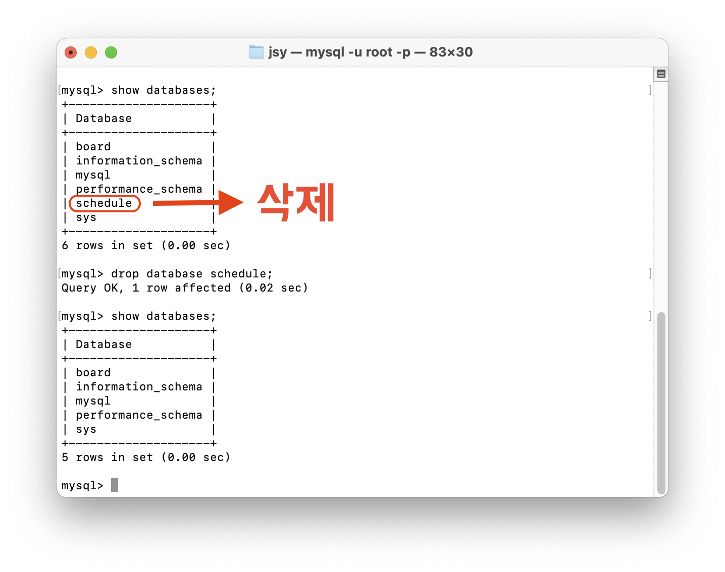 DROP DATABASE 명령어를 사용하여 특정 스키마를 삭제할 수 있습니다.