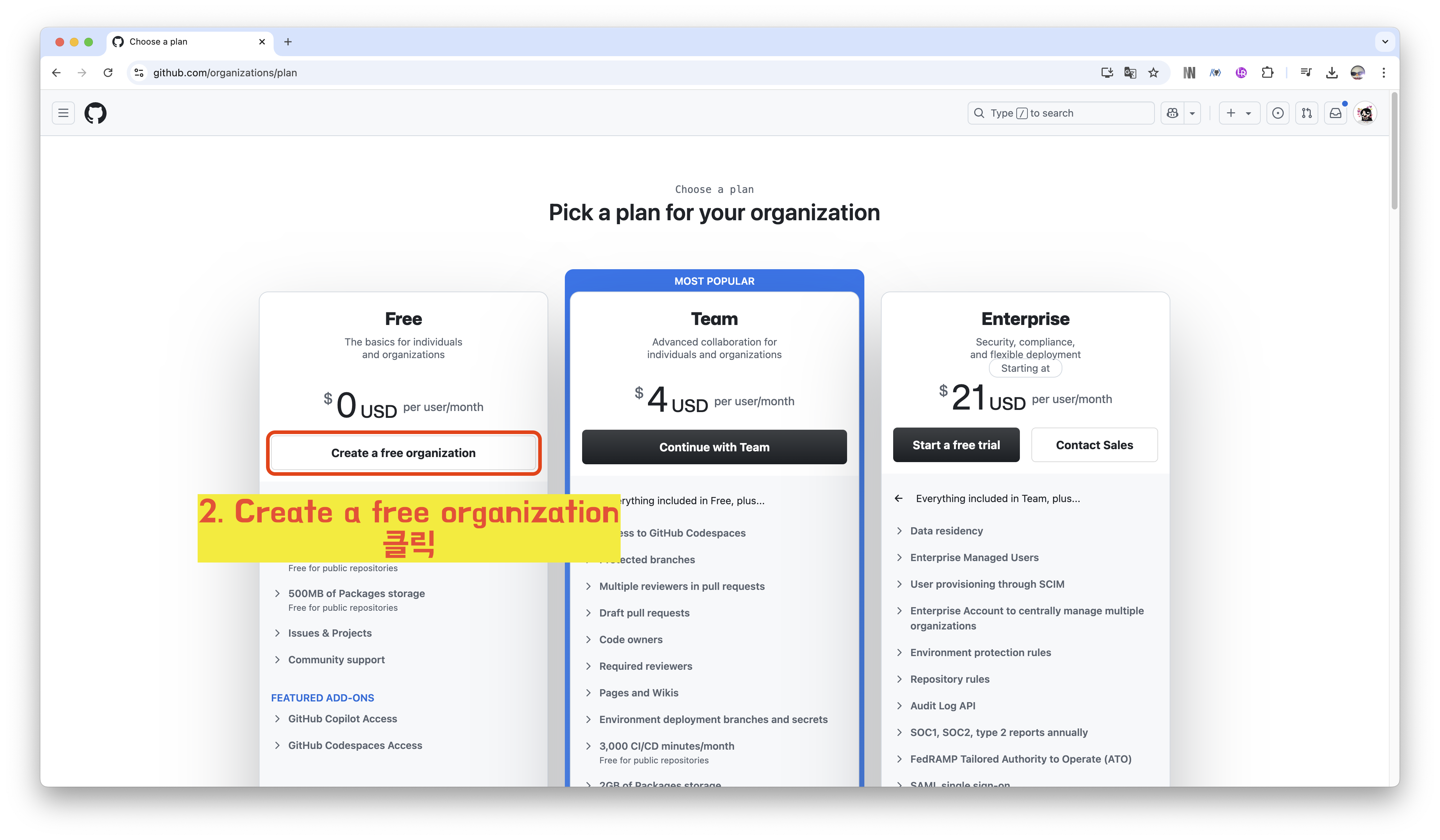 2️⃣ Create a free organization 클릭