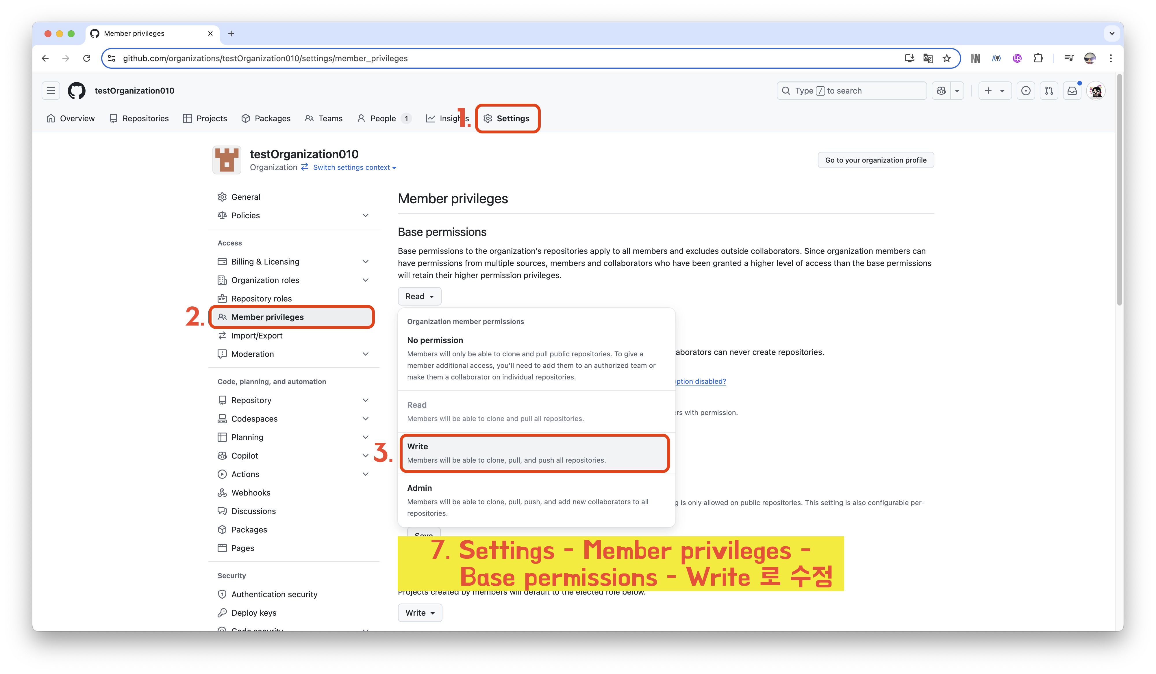 7️⃣ Settings - Member privileges - Base permissions - Write 로 수정