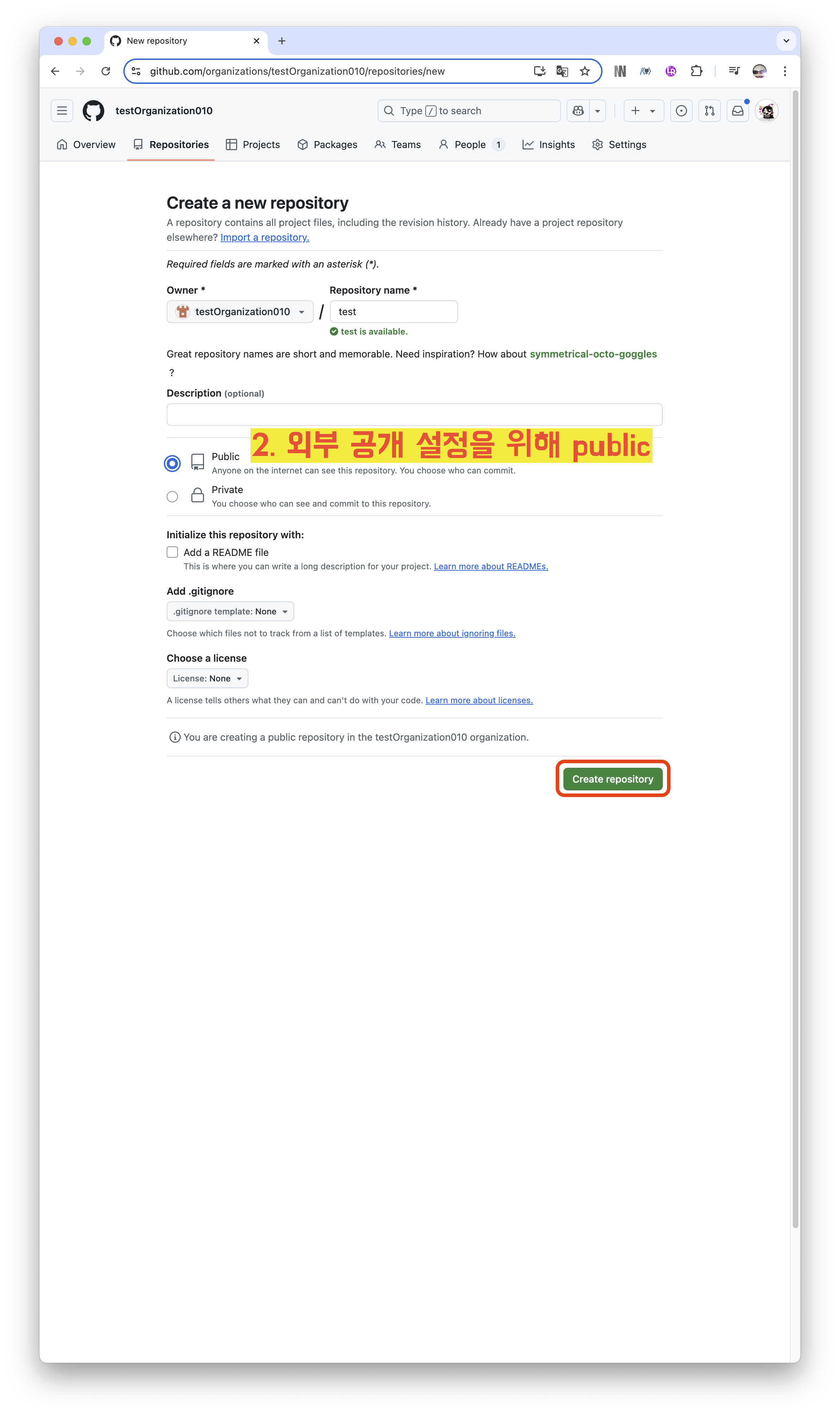 2️⃣ 외부에게 공개 설정을 위해 `Public`으로 생성