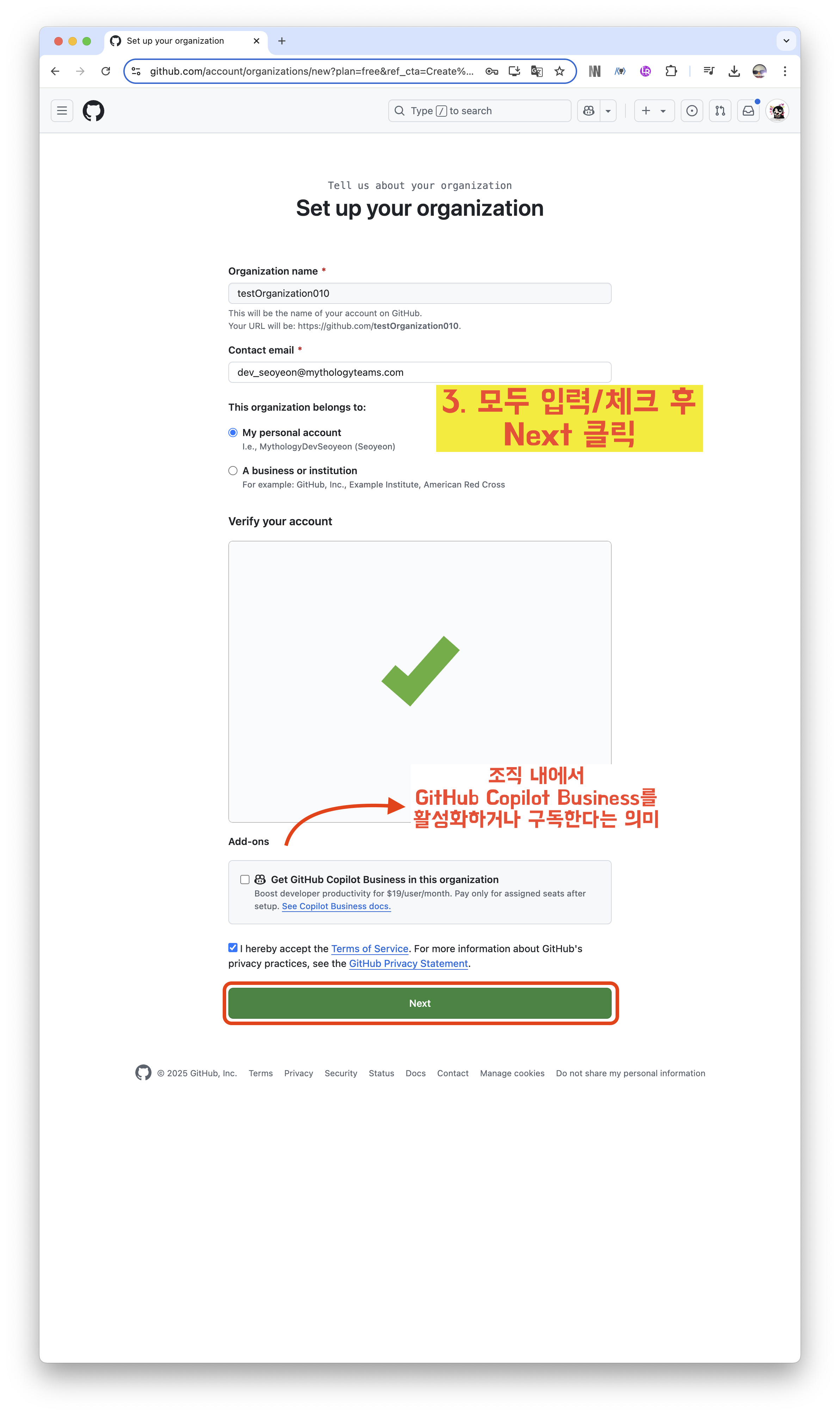 3️⃣ 모두 입력/체크 후 Next 클릭