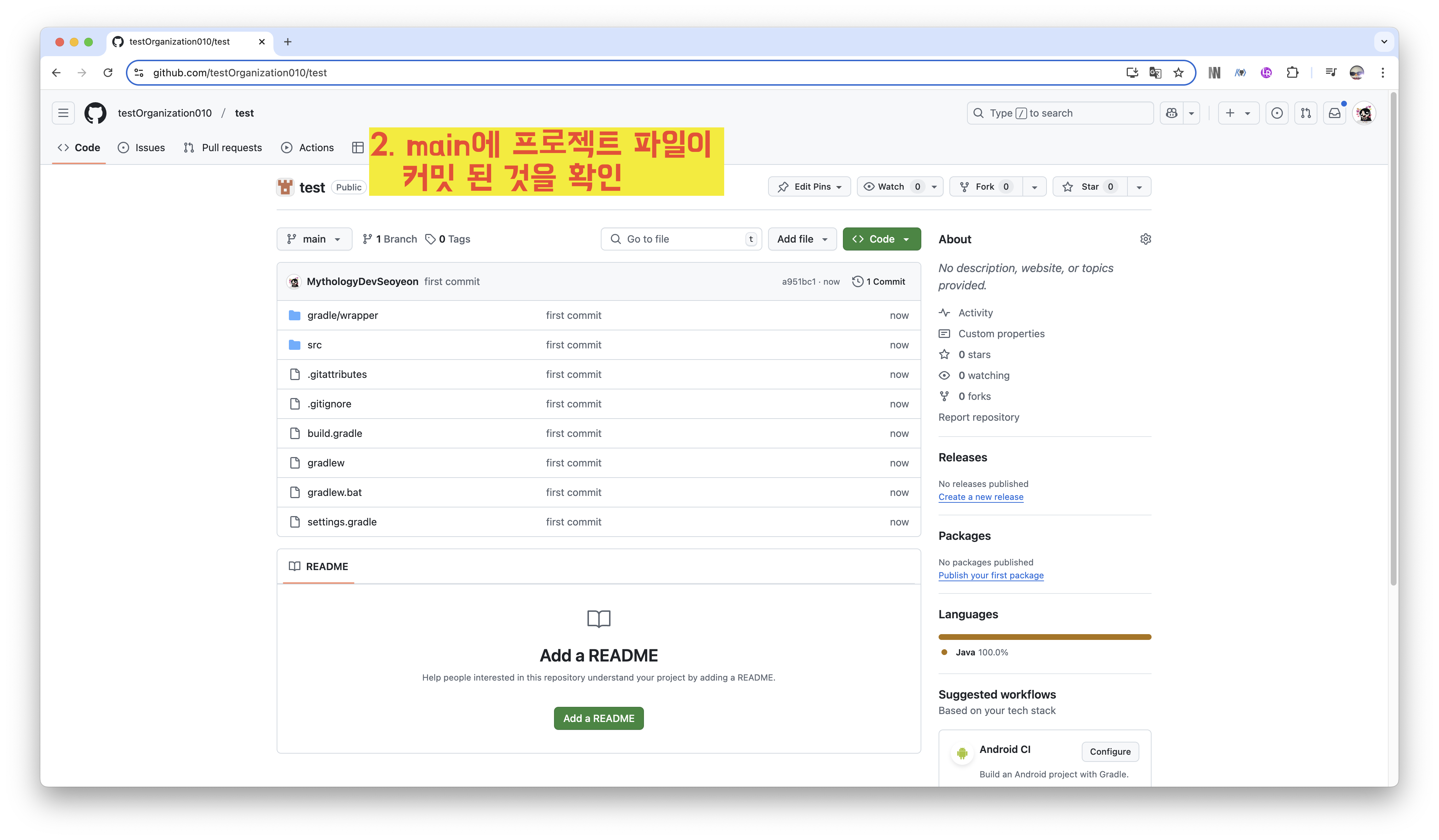 2️⃣ Main에 프로젝트 파일이 커밋 된 것을 확인