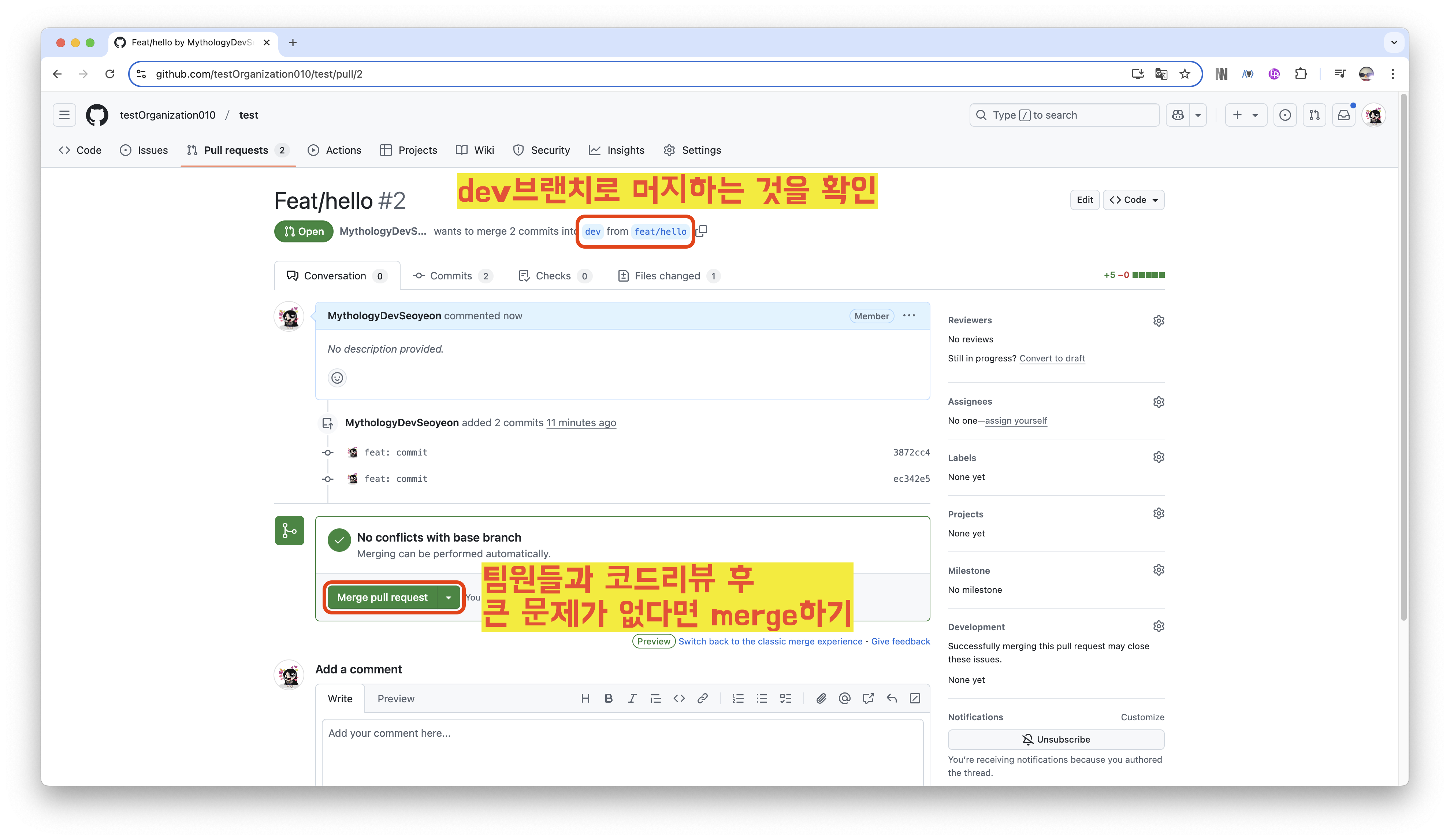 Pull Request를 통해 코드 변경 사항을 검토하고 병합하는 과정을 안내해드리겠습니다.