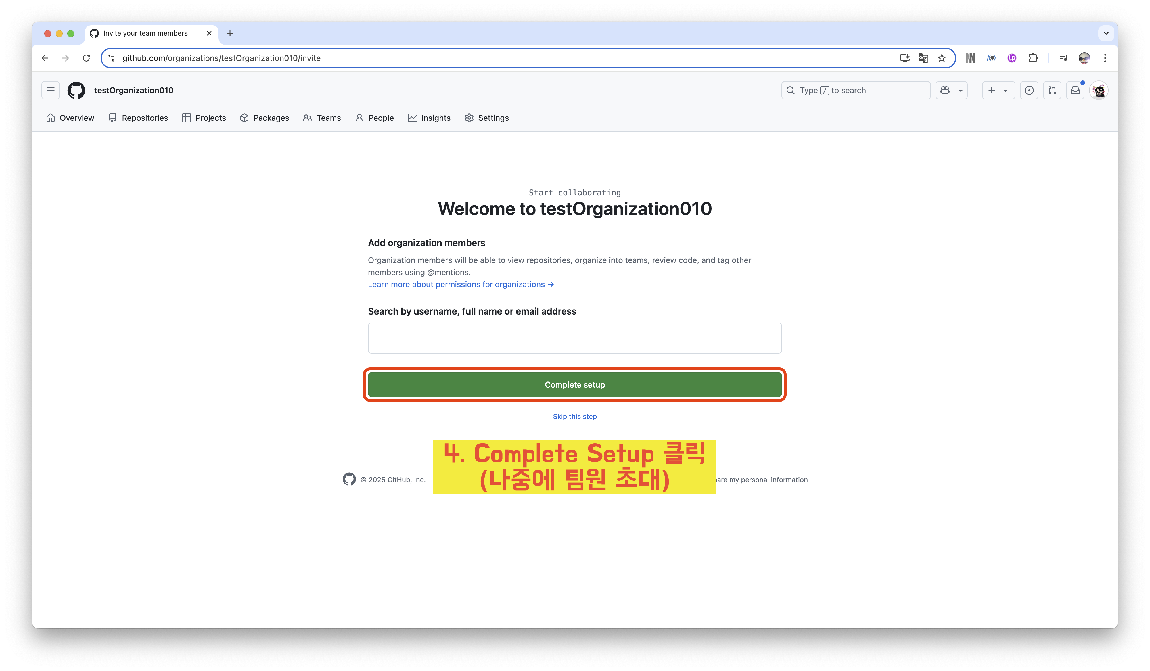 4️⃣ Complete Setup 클릭 (나중에 팀원 초대 권장)