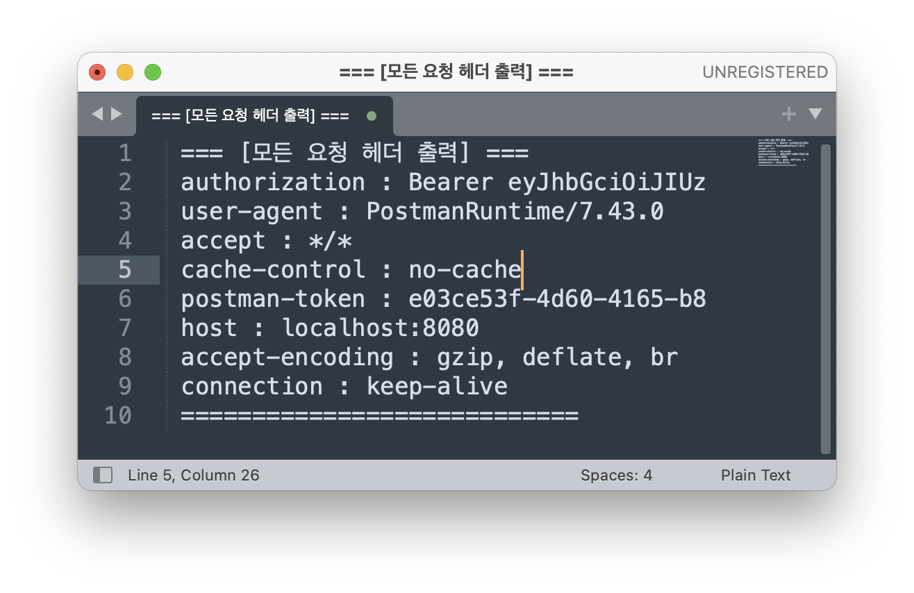 아래 코드는 request의 모든 헤더를 가져와 로그에 출력하는 코드입니다.