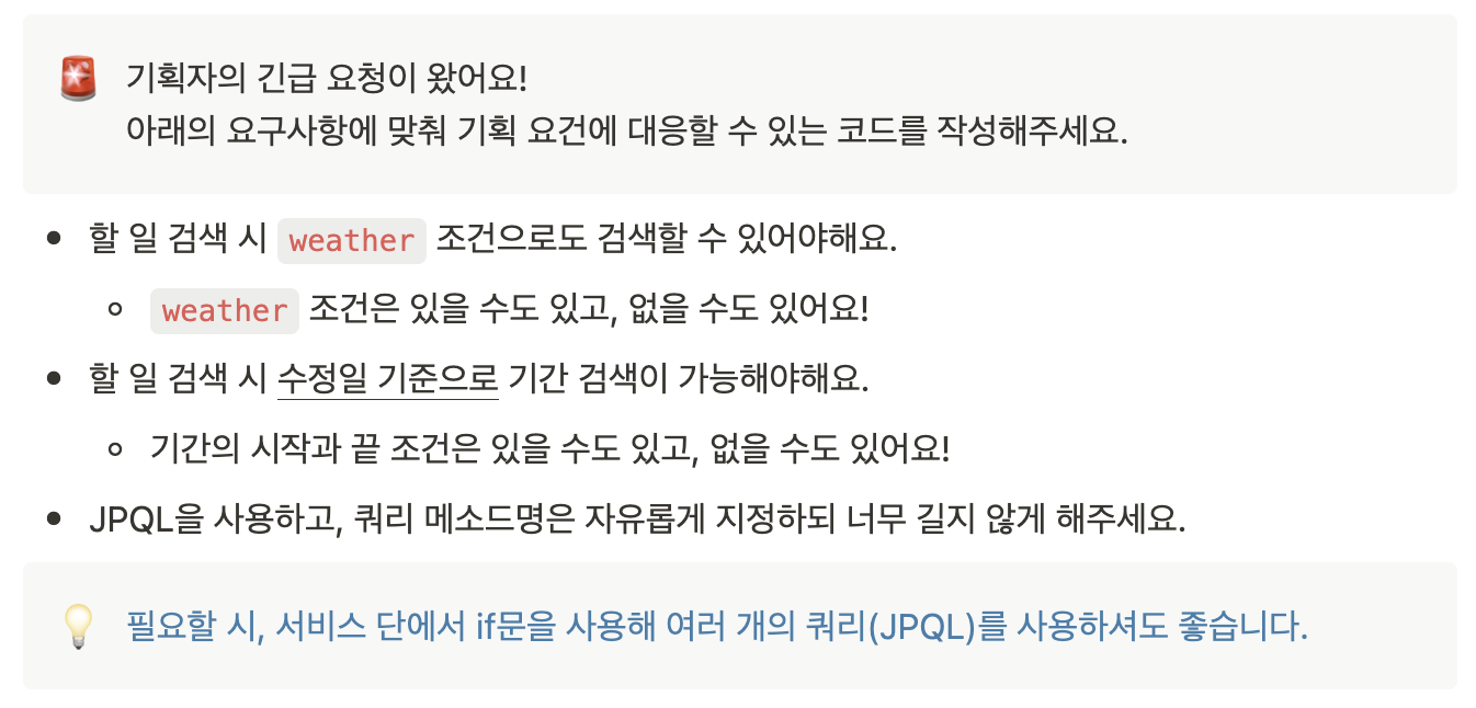 Page<Todo> todos = todoRepository.findTodos(pageable, weather, startDate, endDate);