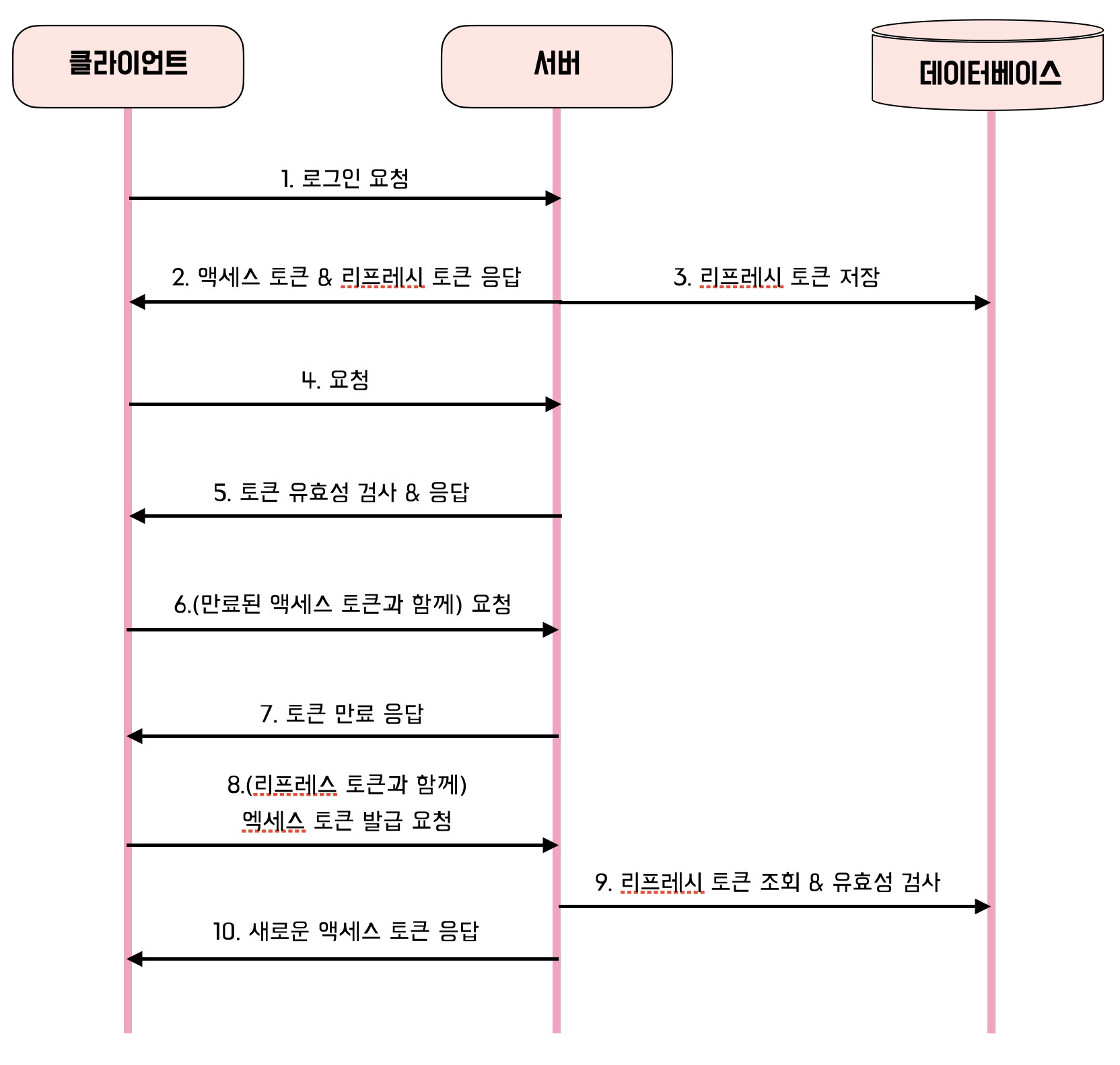 - 서버는 클라이언트가 전달한 정보를 바탕으로 인증 정보가 유효한지 확인한 후, 액세스 토큰과 리프레시 토큰을 전달 → 클라이언트는 전달받은 토큰을 저장