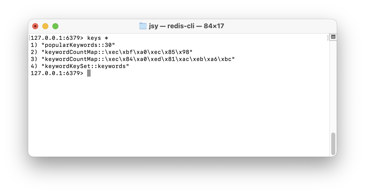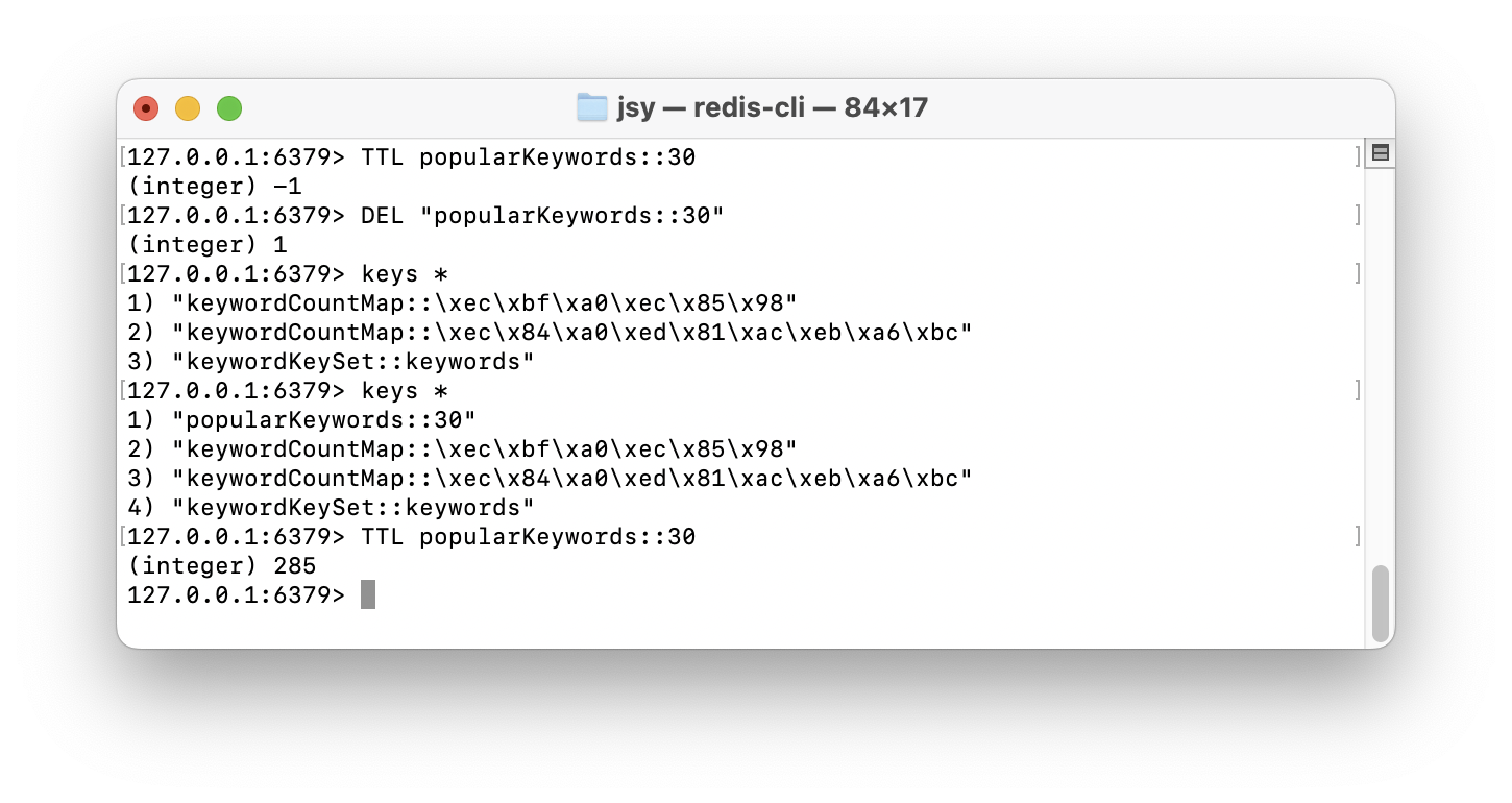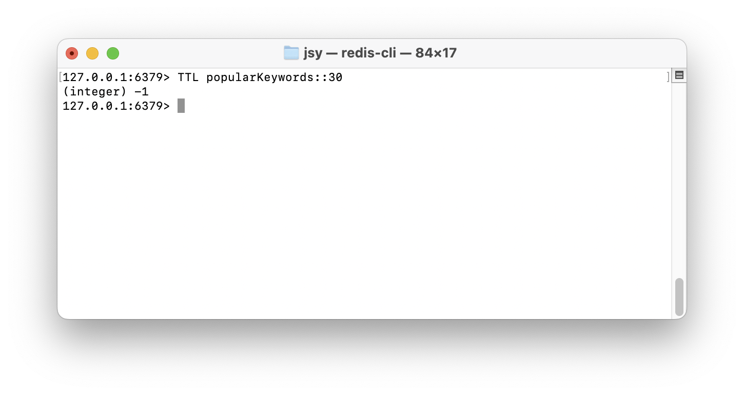 근데 문제는 이미 캐시된 인기 검색어 (popularKeywords::30)가 Redis에서 사라지지 않았다.