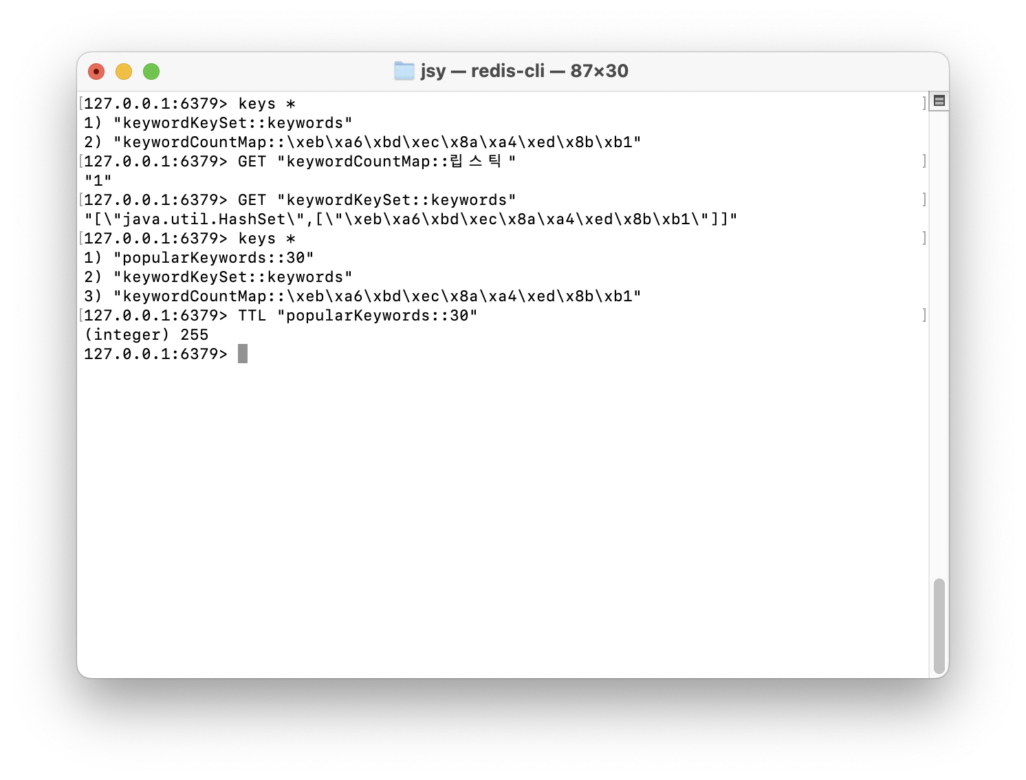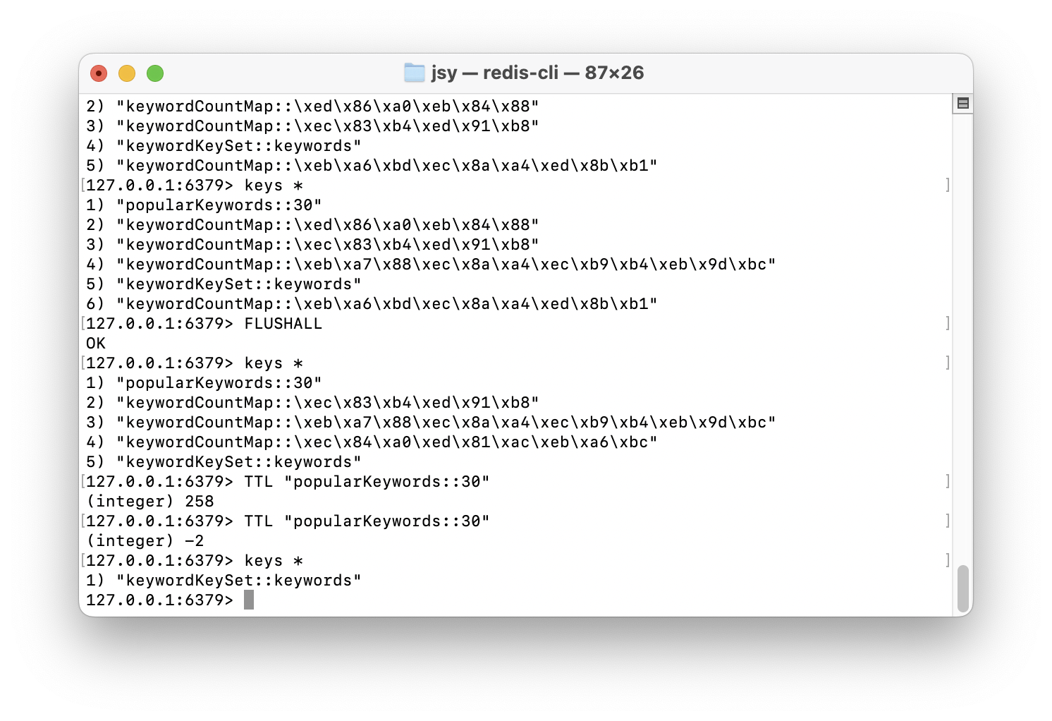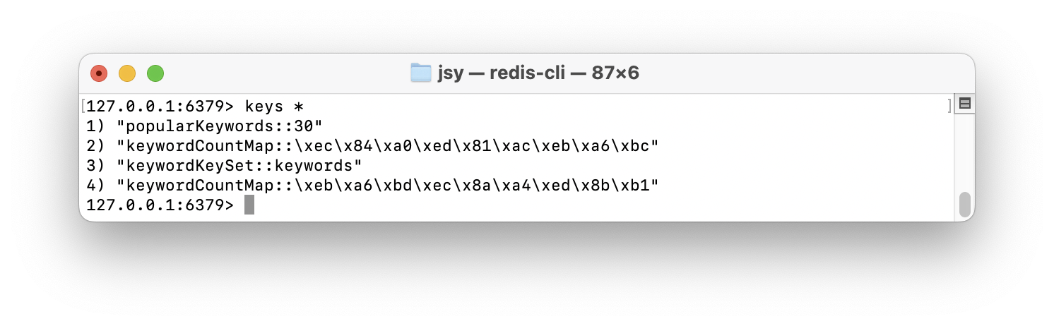근데 문제는 이미 캐시된 인기 검색어 (popularKeywords::30)가 Redis에서 사라지지 않았다.