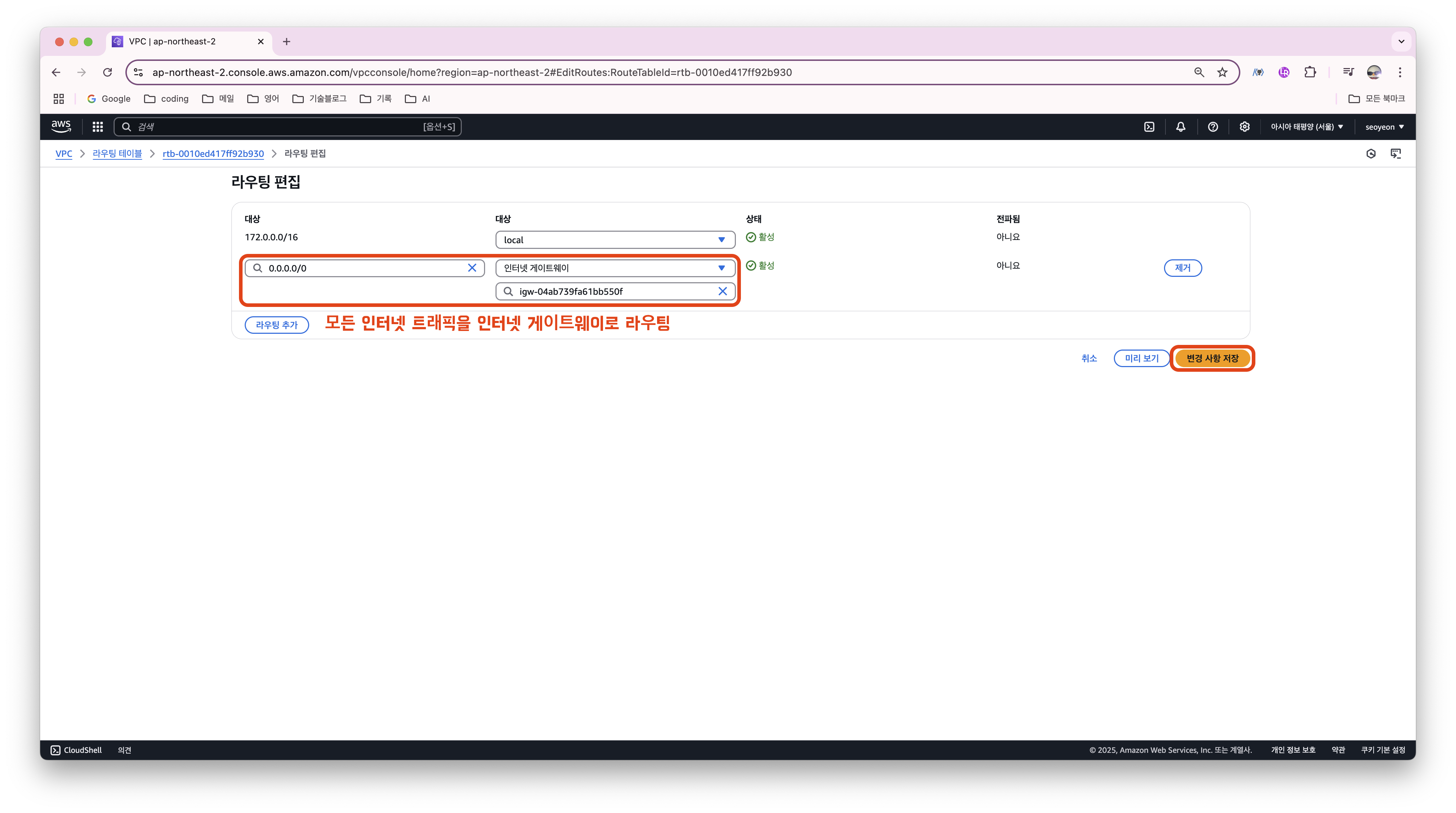 퍼블릭 서브넷 내 리소스가 인터넷과 통신할 수 있도록 했다.