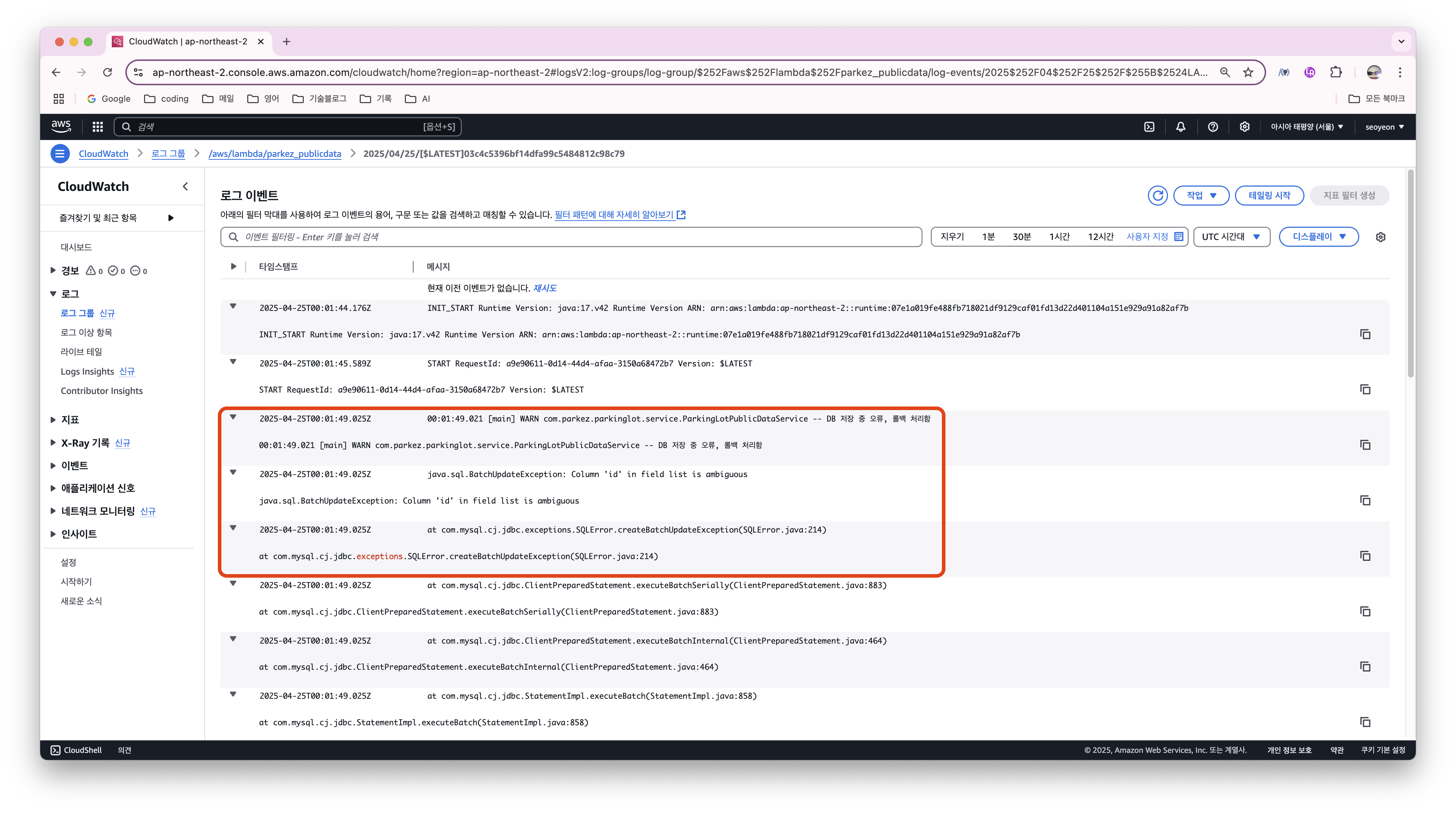 작성했던 sql문에서 에러가 난 것을 확인하였다.