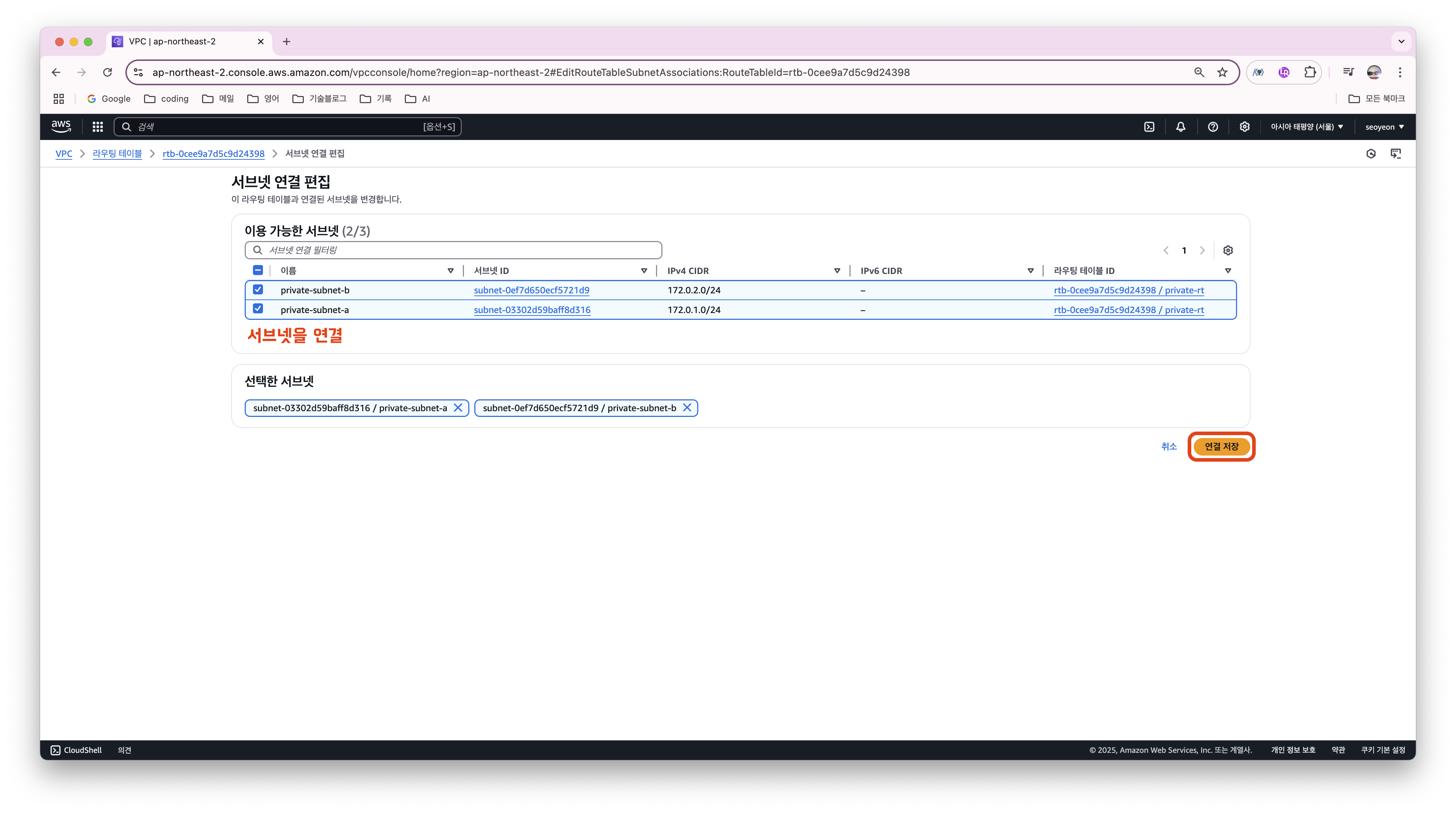 프라이빗 서브넷의 라우팅 테이블에 0.0.0.0/0 → NAT Gateway 경로를 추가하여,