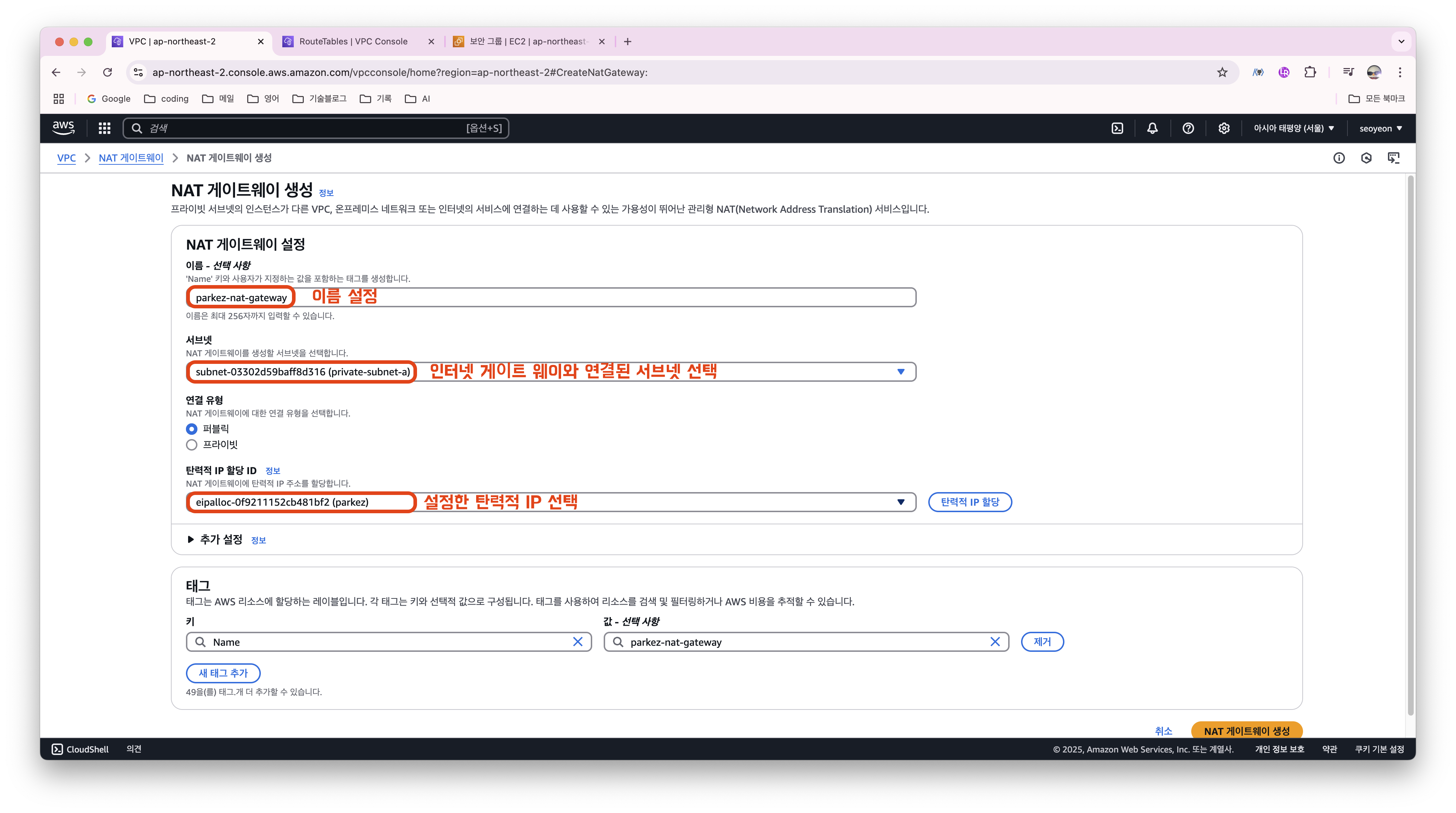 모든 외부 호출이 NAT Gateway를 통해 나가도록 했다.