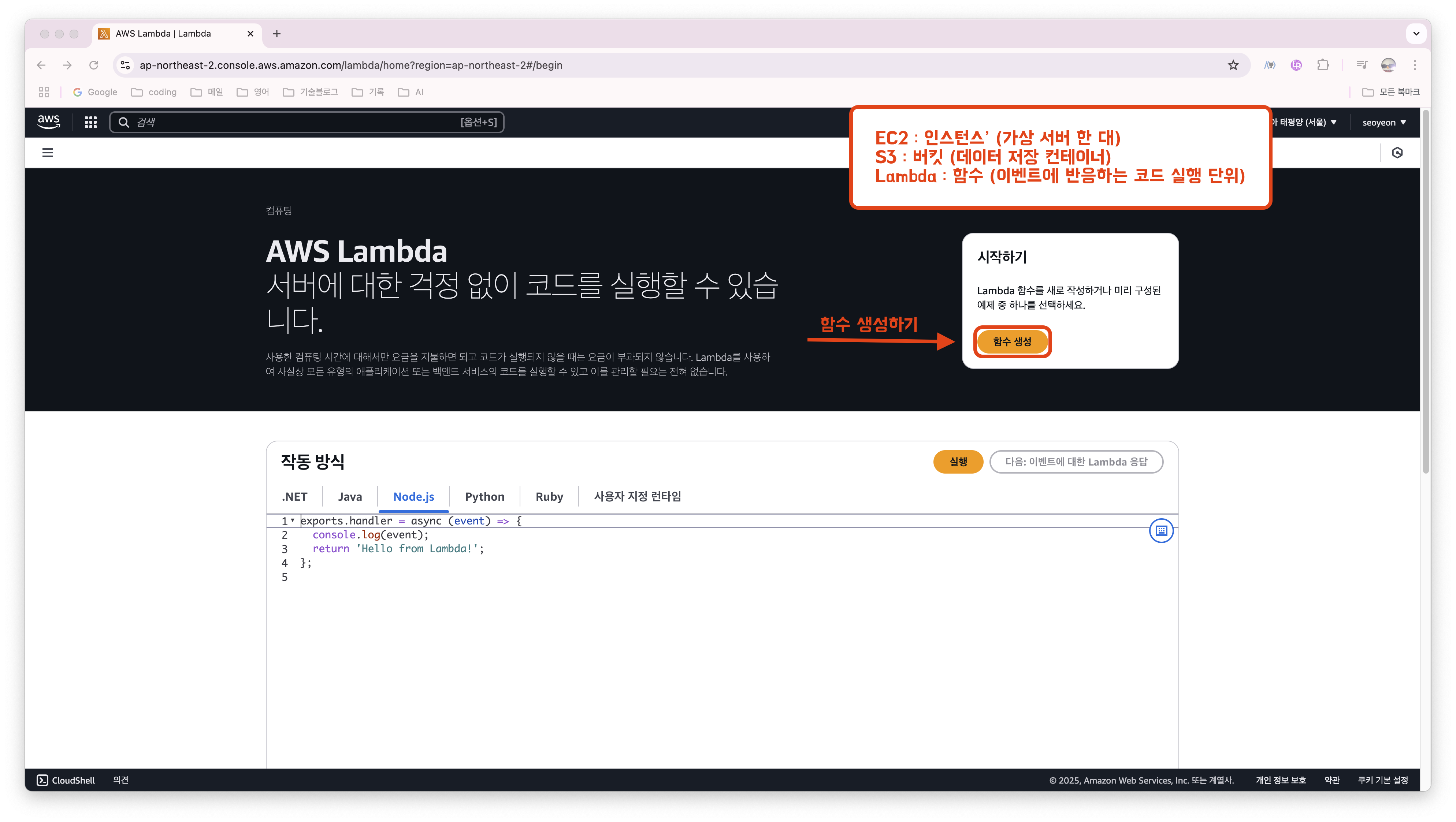 별도의 서버를 구축하거나 운영하지 않고 코드만 실행할 수 있는 서비스이다.